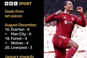 8月-12月期间,利物浦依靠定位球仅3球进账,排名英超垫底。而1月至今,利物浦依靠定位球打入9球,从第20跃升第一!