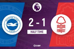 上半场比赛结束,布莱顿2-1诺丁汉森林。